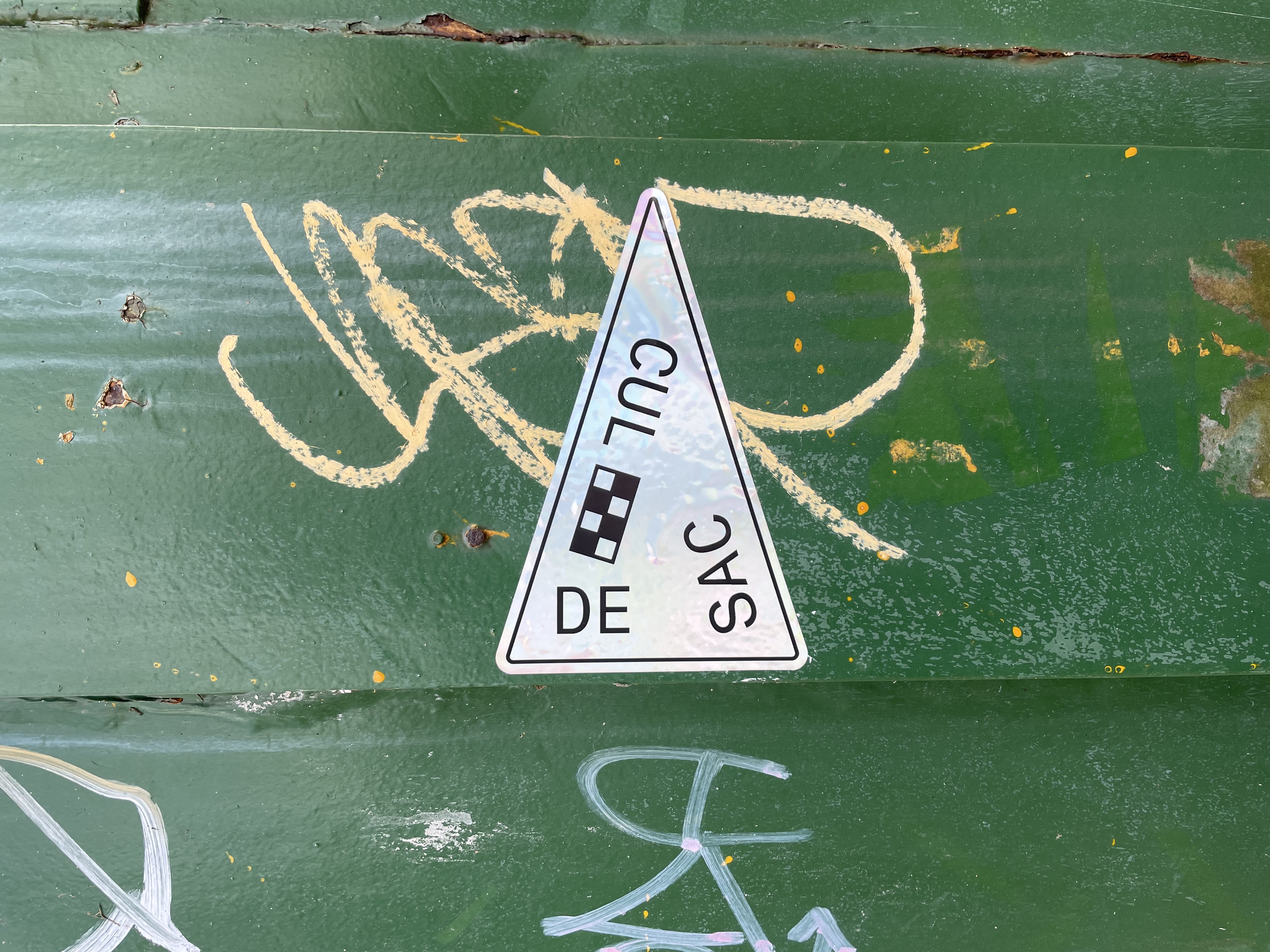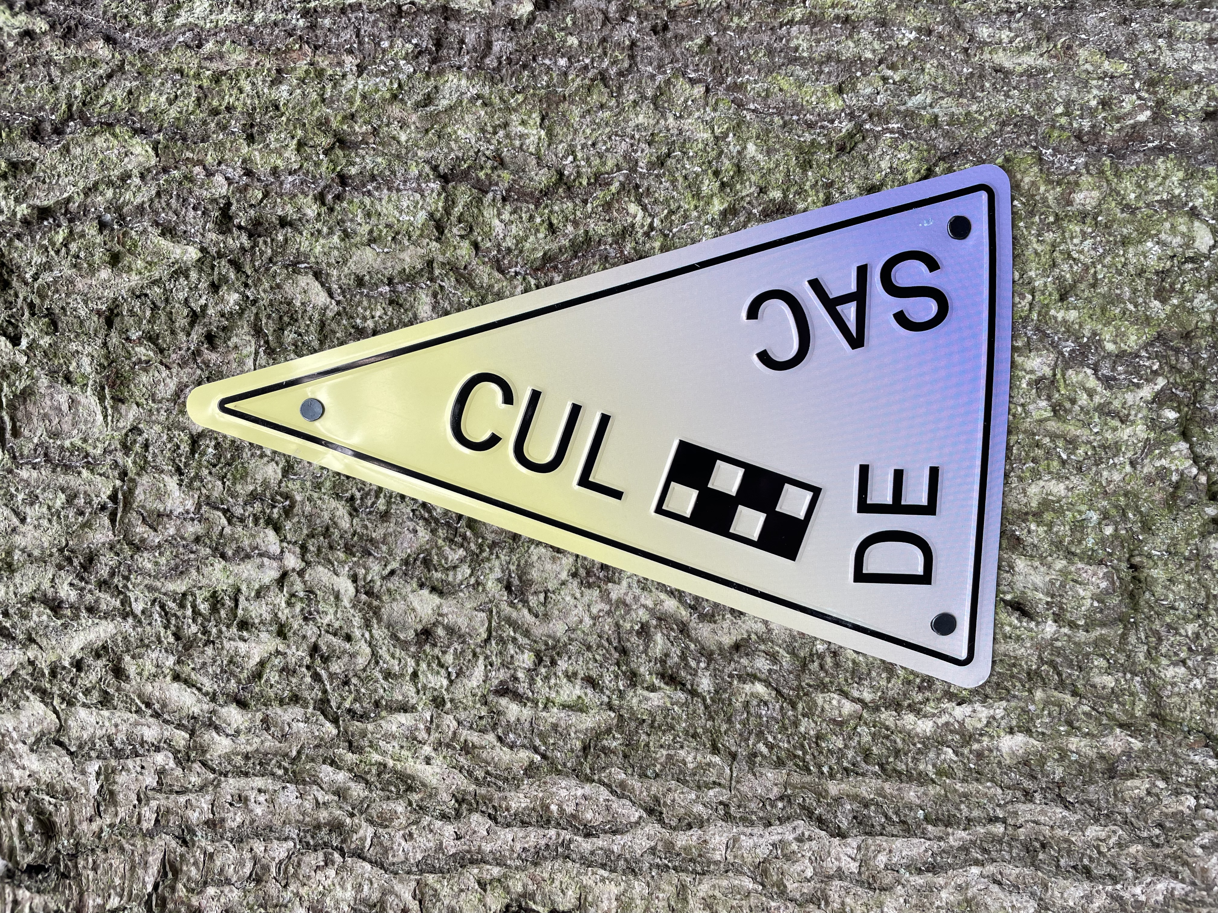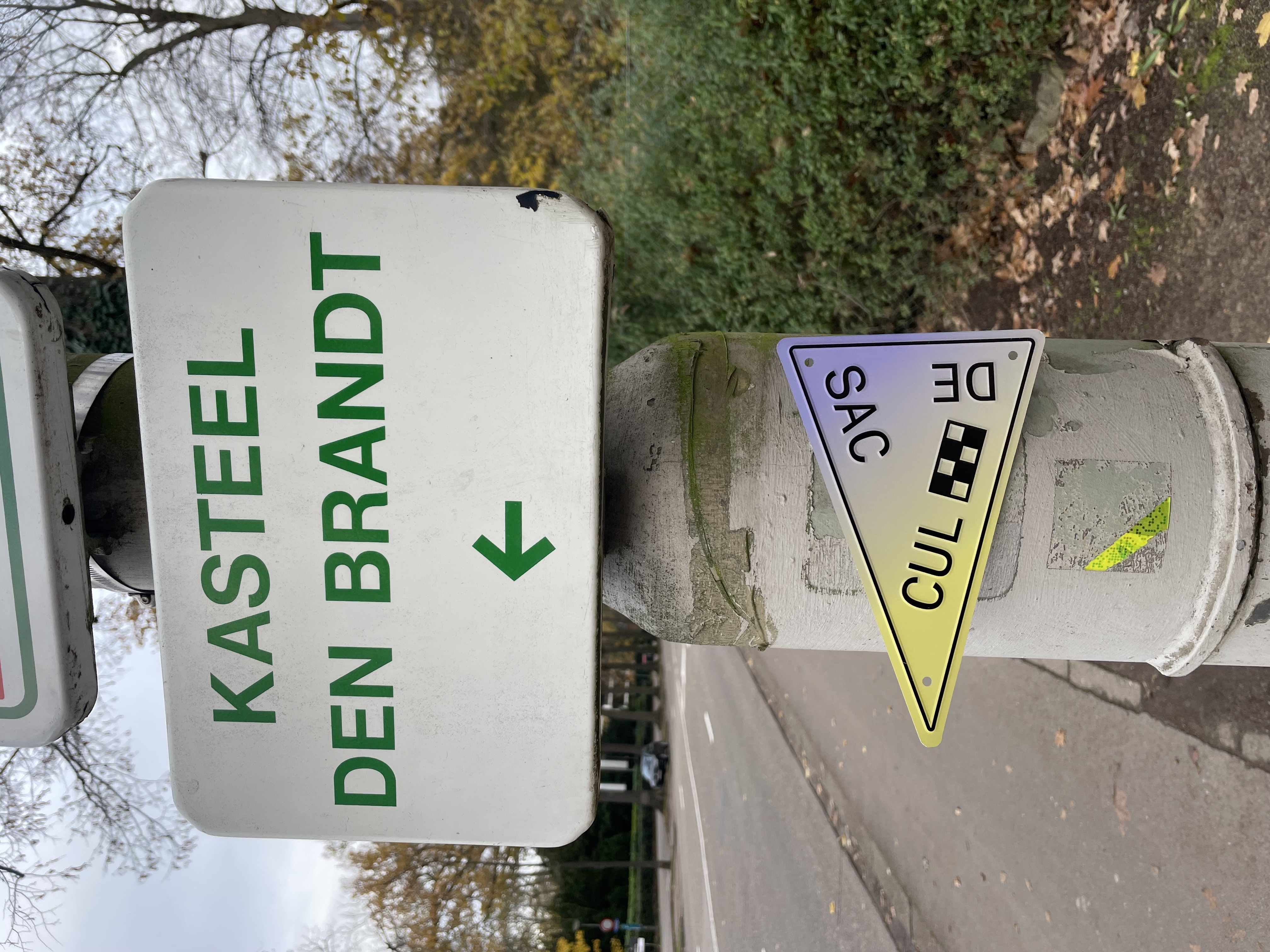 Cul-De-Sac is a long-distance walking route that artist Maarten Inghels marks with his own personal signage. Along the path, Inghels color-codes lampposts, trees, and street features, or attaches metal signs that mark his long-distance trail. Inghels will spend his entire life developing the route.