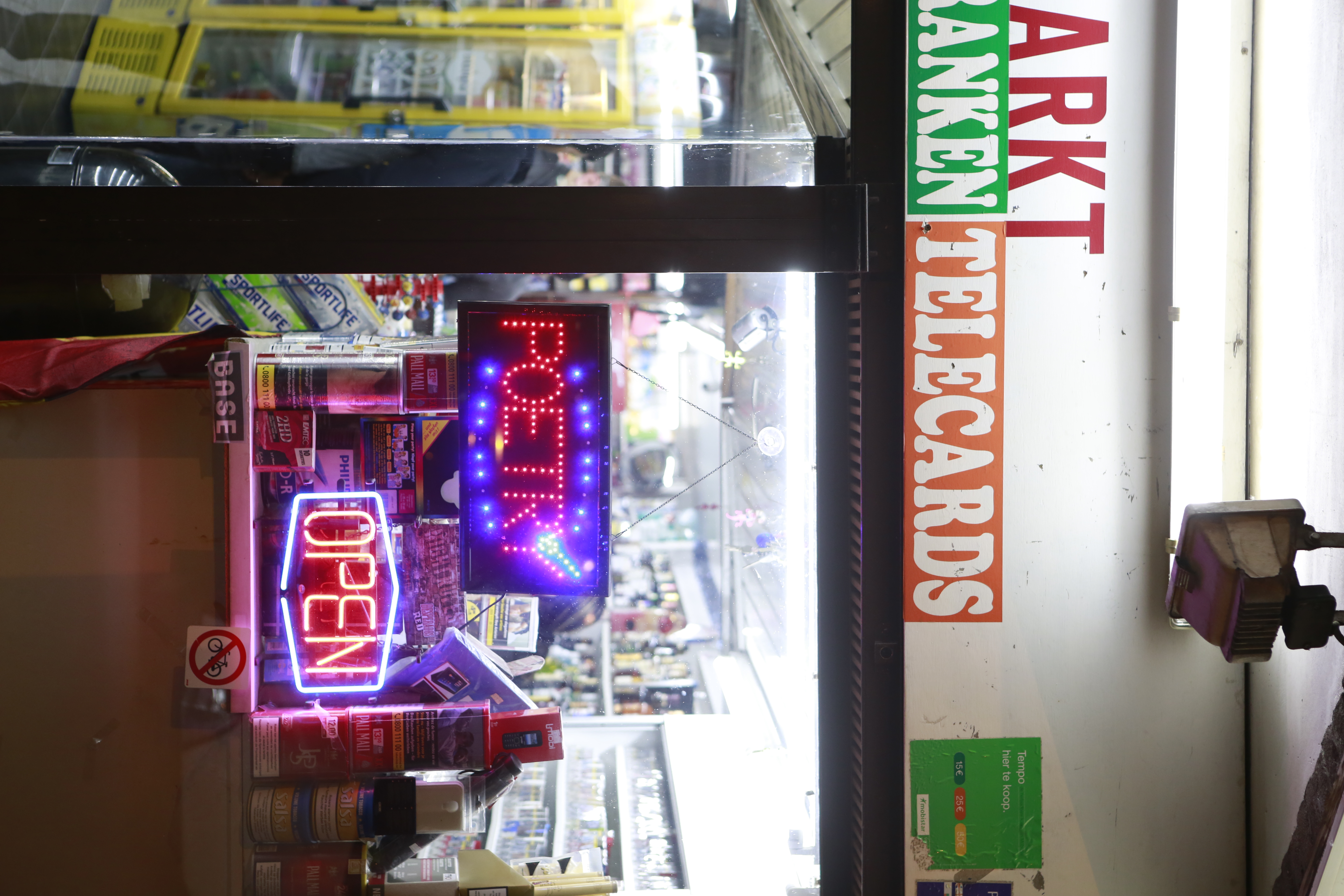 The council of Antwerp installed a special tax for night shops, shisha bars and sex shops which in their belief are ‘image lowering companies’ for the city. Maarten Inghels wondered if poetry could lift their image. He made custom LED-displays with 120 blinking red and blue lights with the word POETRY and a cocktail glass and installed them in ten different night shops.