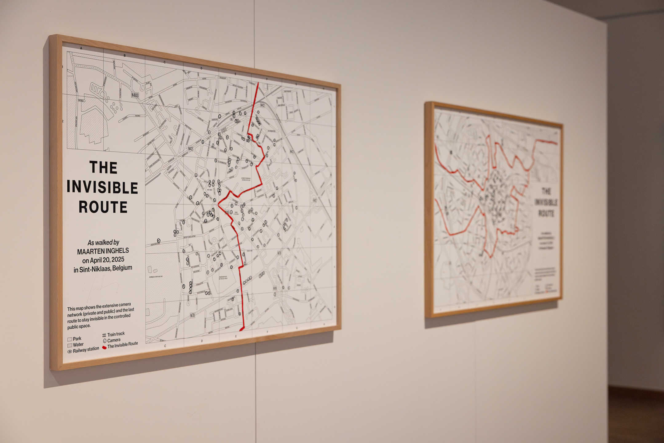 ‘The Invisible Route’ eist op poëtische wijze het recht op om onzichtbaar te zijn en speelt in op eerdere motieven uit Inghels’ werk: de frictie tussen openbaarheid en het private. Deze kaarten zijn het resultaat van zijn dwaaltochten in Antwerpen (2017), Hasselt (2019) en Sint-Niklaas (2025).