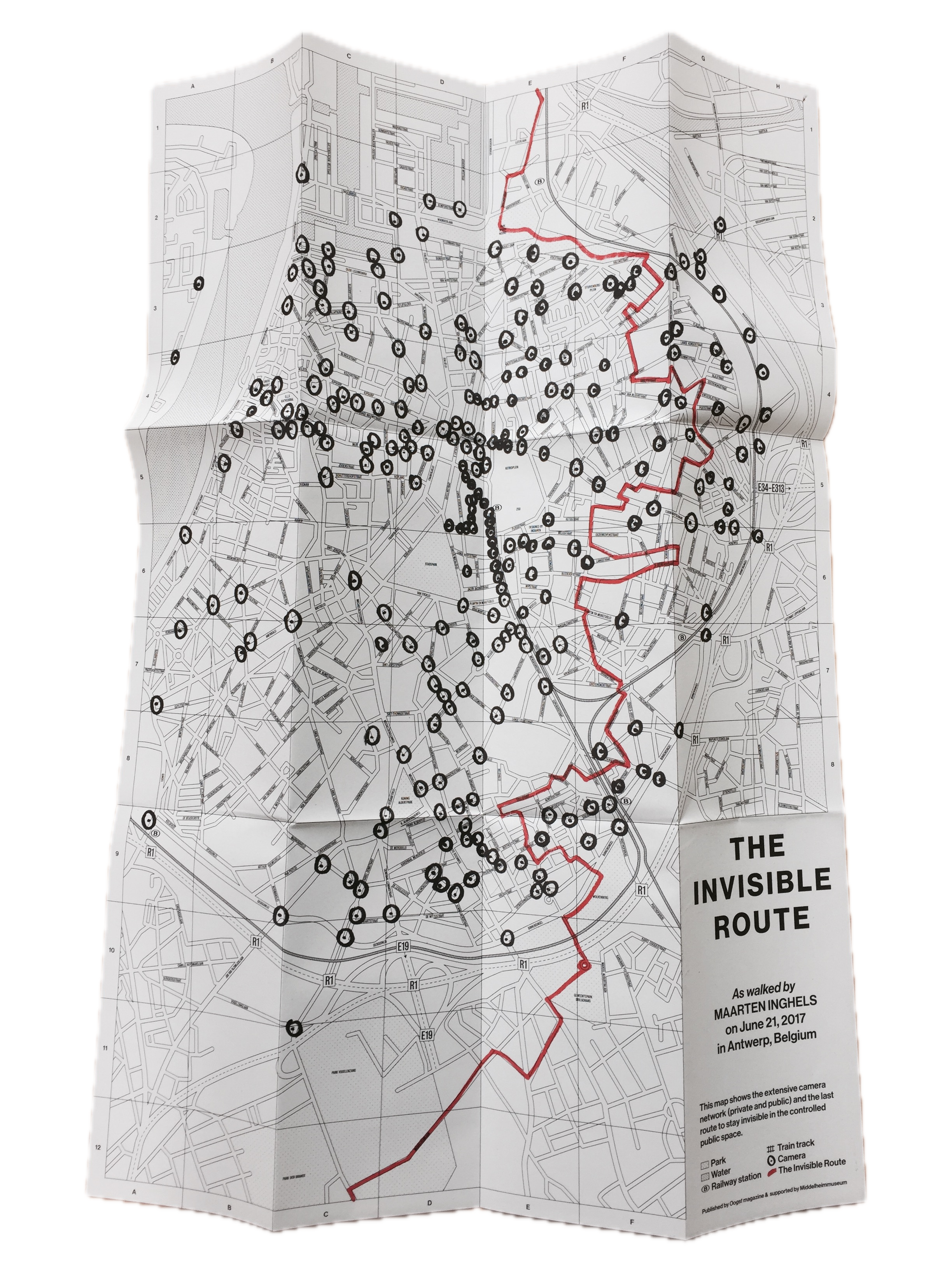 ︎ In 2017 maakte Inghels een eerste editie voor de voetganger in Antwerpen om van het noorden naar het zuiden door de stad te wandelen. De kaart verscheen als object bij Oogst Magazine nr. 11, begeleid door een essay (met dank aan het Middelheim Museum Antwerpen).